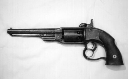 This very unique military revolver was especially produced for Civil War use. It was designed from the pre-war Savage "figure eight" revolver. Instead of being thumb cocked, the middle finger of the hand was used to draw back the lever and then push it forward which cocked the hammer and rotated the cylinder. Clumsy in appearance, it is not that difficult to get the "hang of" with just a little practice.